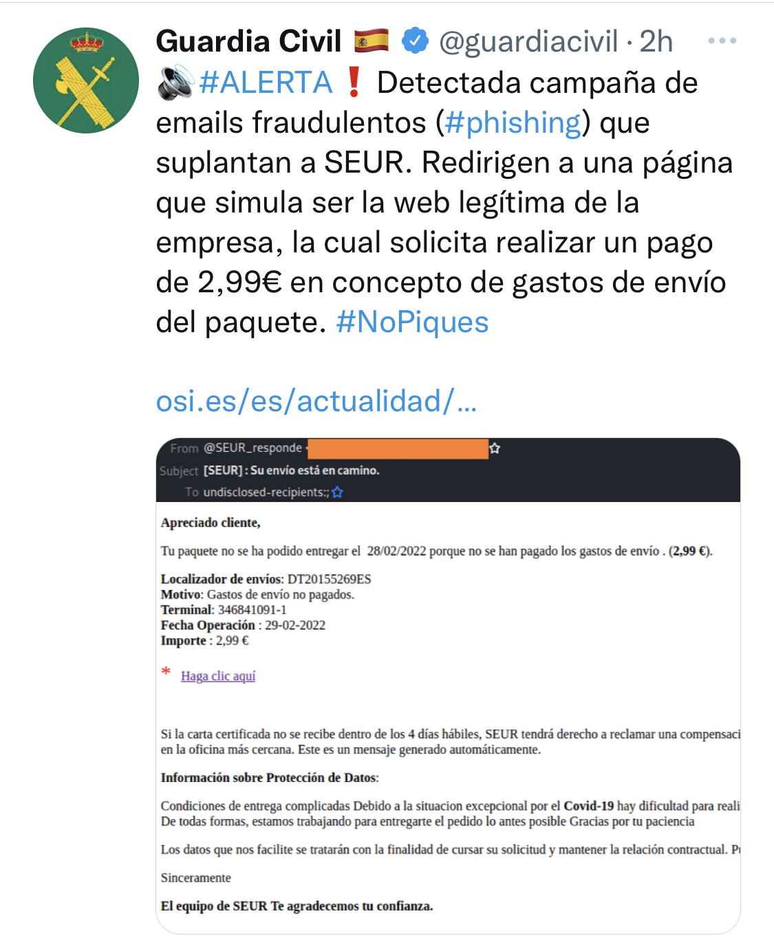 Mensajes fraudulentos que suplantan a SEUR solicitándote dinero
