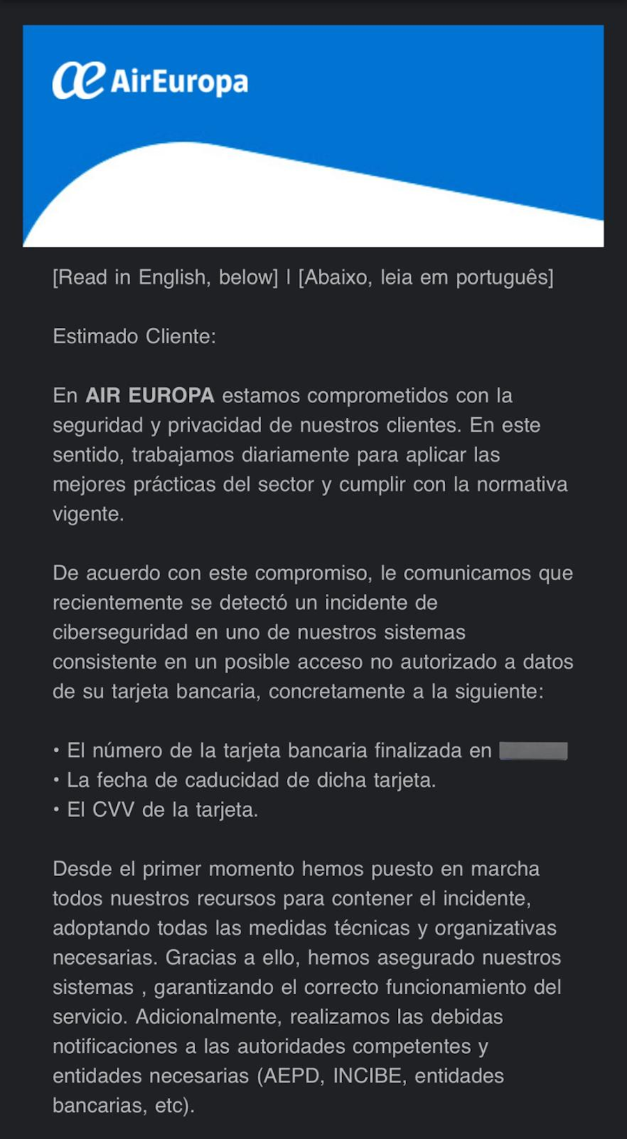 Air Europa informa de un ciberataque y comunica a sus clientes cancelar su tarjeta bancaria