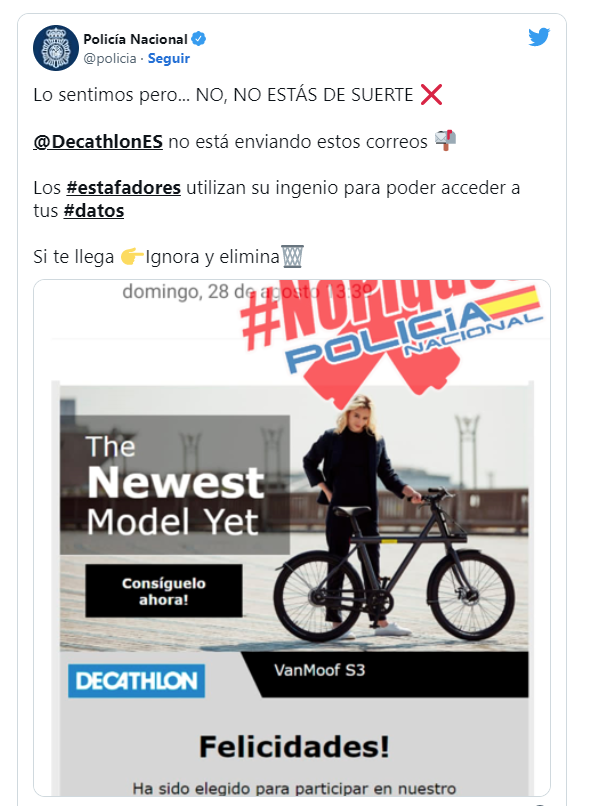 La Policía alerta de una estafa con un premio falso de Decathlon como gancho