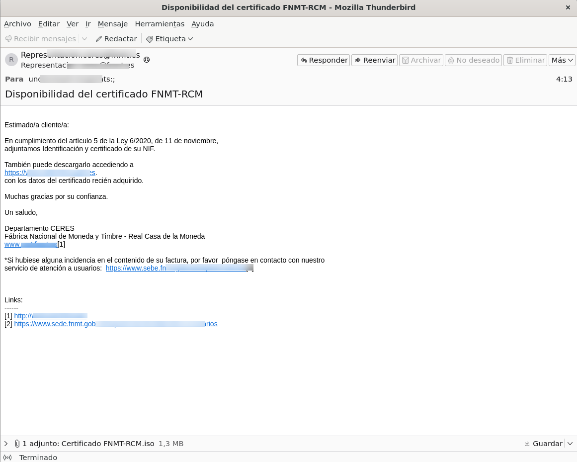 Distribución de malware mediante la suplantación de la Fábrica Nacional de Moneda y Timbre simulando el envío de tu certificado digital